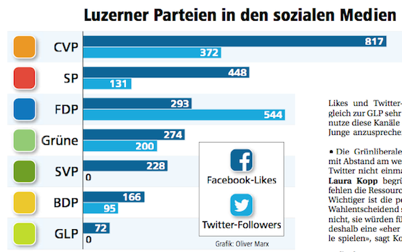 Ein Unding: Die Wirkung von Social Media wird oft einzig und allein mit der Anzahl “Follower“ auf Twitter und „Likes“ auf Facebook bewertet. Gerade politische Akteure fokussieren auf diese Messgrösse. Exemplarisch das Beispiel der Luzerner Kantonalparteien, die im Wahlkampf stehen. Am 29. März werden dort Parlament und Regierung bestimmt. Heute nahm sich die „Neue Luzerner Zeitung“ (NLZ) dem Thema an und publizierte diese Grafik: